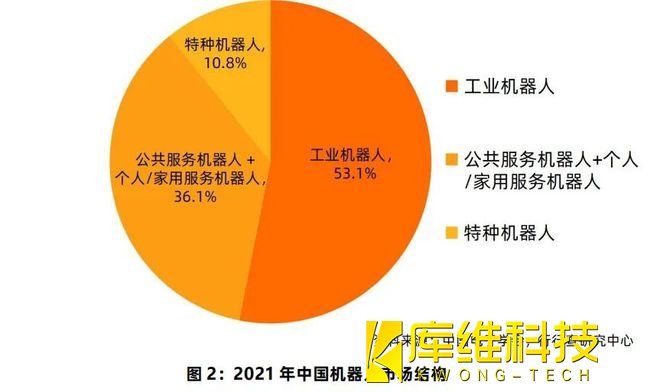 根據中國電子學會發布的《中國機器人產業發展報告(2021年)》(以下簡稱《報告》)顯示,2021年我國機器人市場規模預計達到839億元,其中工業機器人市場規模約為445.7億元,占比為53.1%;服務機器人市場規模約為393.3億元,占比為46.9%。而在服務機器人市場中,公共服務機器人及個人/家用服務機器人的市場規模預計達302.6億元,占總市場規模的36.1%;特種機器人市場規模約為90.7億元,占總市場規模的10.8%。