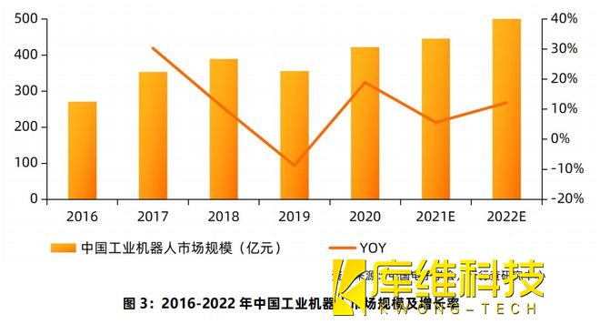 《報告》公布的數據顯示,我國工業機器人市場規模近五年的年均復合增速超過12%,現已成為全球第一大工業機器人應用市場。而據國家統計局公布的數據顯示,繼2020年全國工業機器人產量突破20萬套大關后,2021年全國工業機器人產量成功突破30萬套大關,達到36.6萬套,同比增長44.9%,創歷史新紀錄。伴隨著國內工業制造領域的生產智能化改造和數字化升級的浪潮,工業機器人將繼續保持樂觀的發展前景,預計2022年我國工業機器人市場規模將迫近500億元。