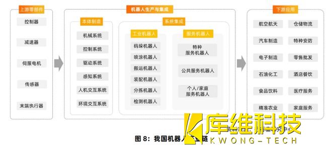 機器人產業鏈主要分為上游核心零部件研發與生產、中游本體制造和系統集成,以及下游各行各業的具體應用等三方面: