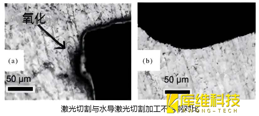 在金屬板材切割方面,用傳統(tǒng)激光與水導(dǎo)激光分別切割不同厚度的AISI1020鋼板,發(fā)現(xiàn)水導(dǎo)激光大大降低了材料表面粗糙度,并最大限度減少了與傳統(tǒng)激光切割相關(guān)的問題,例如切口和熱損傷。同時,與傳統(tǒng)激光切割相比,水導(dǎo)激光切割產(chǎn)生的白層更小,表面波紋也得到顯著改善。通過對比還發(fā)現(xiàn),在切割速度一致的情況下,水導(dǎo)激光切割在材料表面粗糙程度和內(nèi)部結(jié)構(gòu)熱影響區(qū)方面優(yōu)勢明顯,這一特性在不銹鋼切割對比中也得到充分驗證。