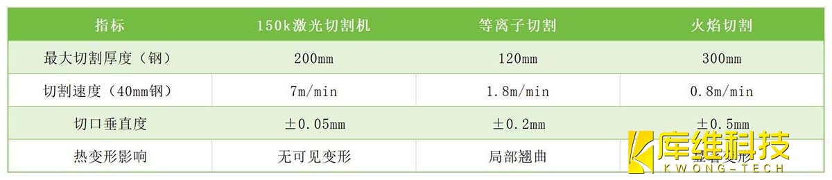 傳統(tǒng)等離子切割或水刀工藝在超厚板(≥40mm)加工中普遍面臨效率低、熱影響區(qū)大、切口粗糙等問題。而150k激光切割機(jī)通過以下技術(shù)參數(shù)實(shí)現(xiàn)跨越式升級(jí):