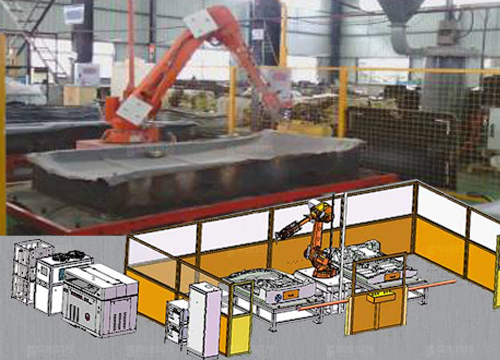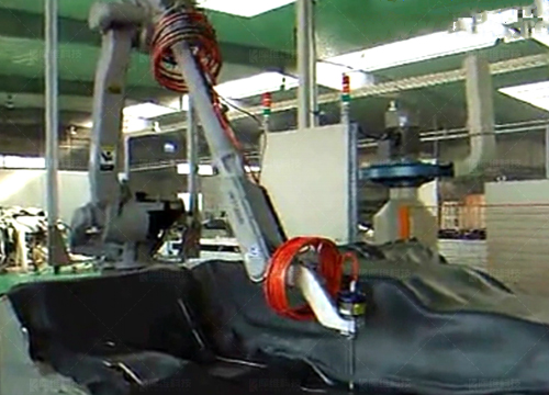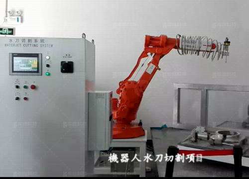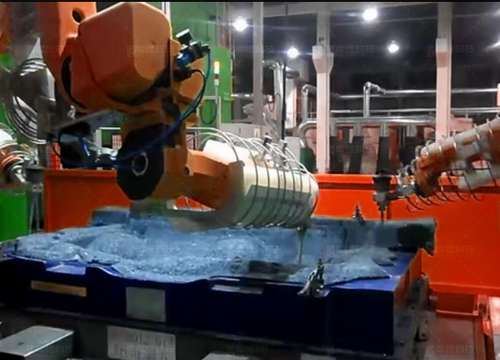 FA水切割,機器人可交替在兩個工位切割作業,另一工位上下料,適合尺寸較大,精度要求高,復雜異形材料等切割加工,如車用頂棚、地毯等汽車內飾件。